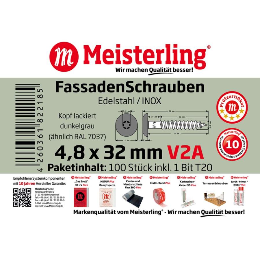 100 x MEISTERLING® FASSADENSCHRAUBEN INOX V2A 4,8 x 32 MM FLACHKOPF TORX T20 DUNKELGRAU + 1 BIT