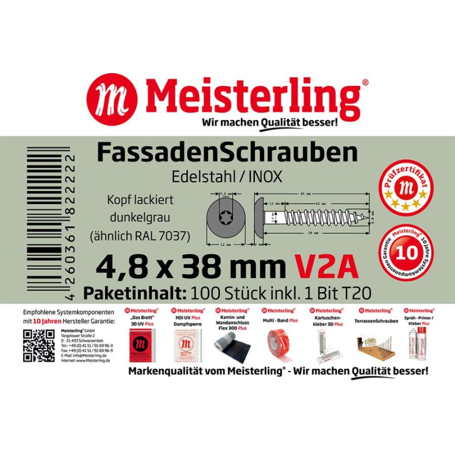 100 x MEISTERLING® FASSADENSCHRAUBEN INOX V2A 4,8 x 38 MM FLACHKOPF TORX T20 DUNKELGRAU + 1 BIT