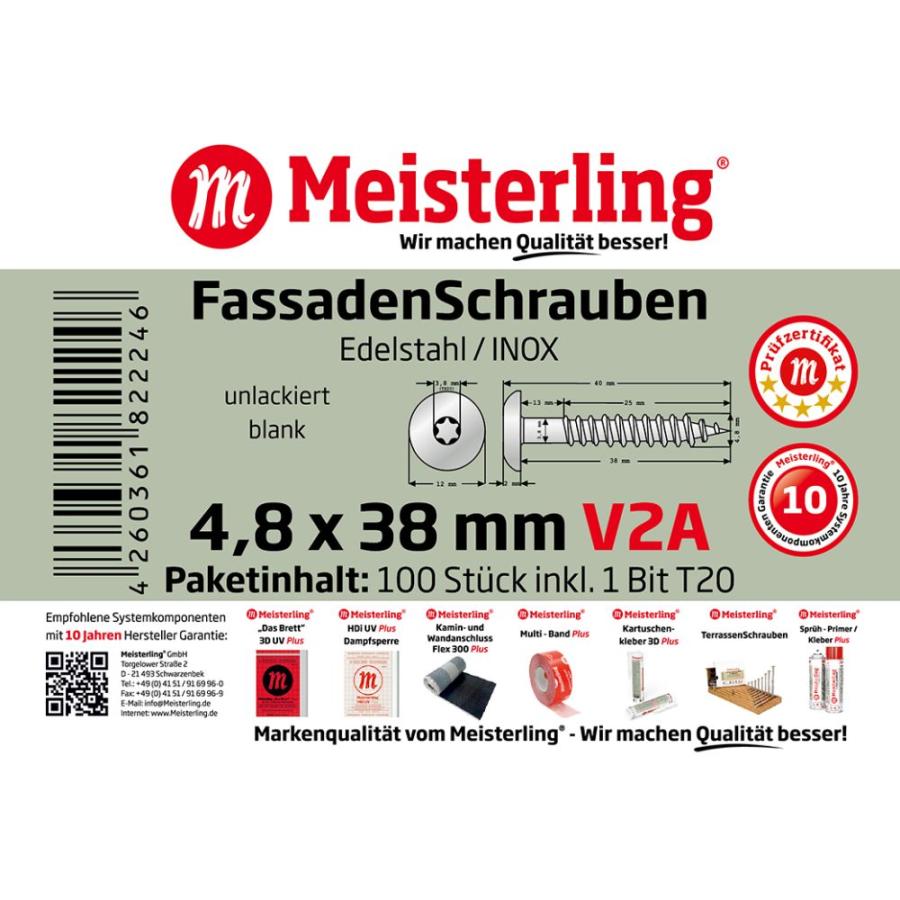 100 x MEISTERLING® FASSADENSCHRAUBEN INOX V2A 4,8 x 38 MM FLACHKOPF TORX T20 UNLACKIERT + 1 BIT