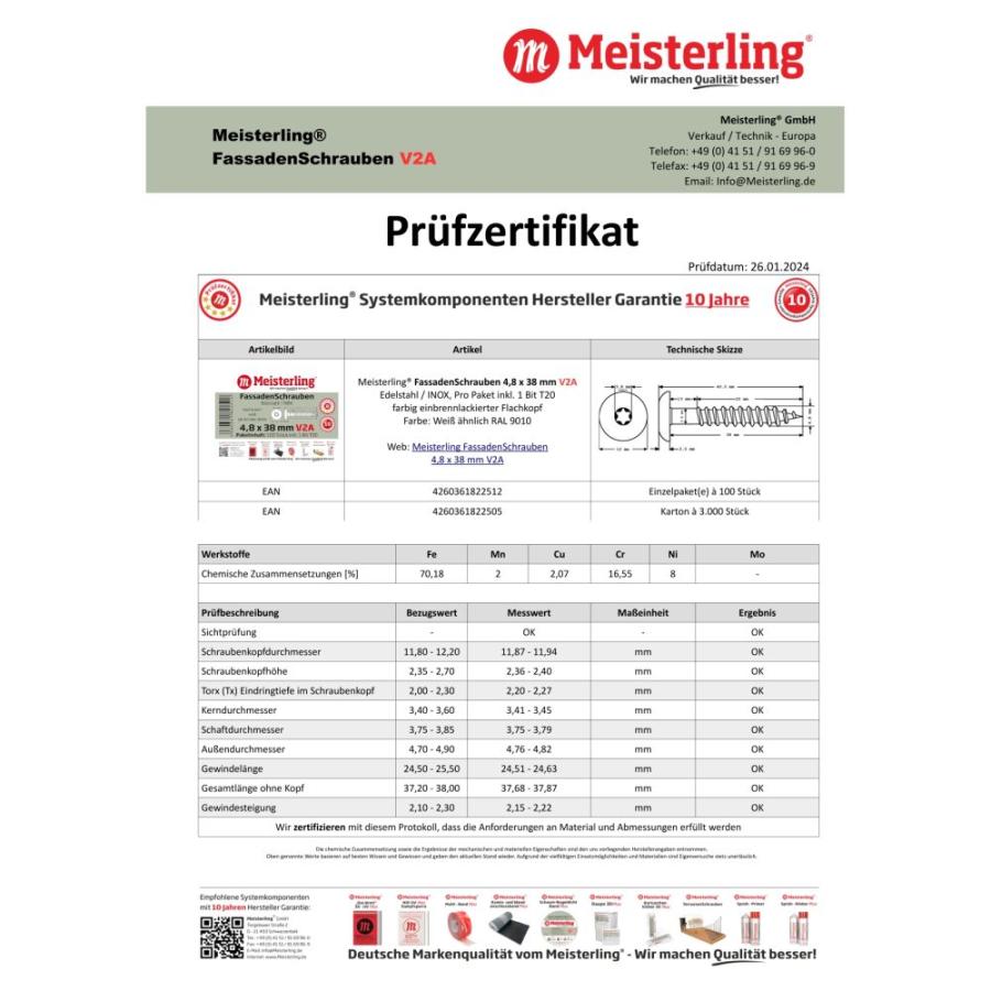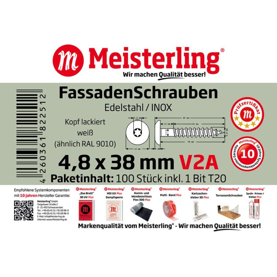 - 100 x MEISTERLING® FASSADENSCHRAUBEN INOX V2A 4,8 x 38 MM FLACHKOPF TORX T20 WEISS ÄHNLICH RAL 9010 + 1 BIT