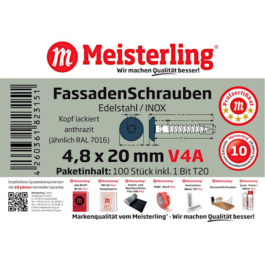 - 100 x MEISTERLING® FASSADENSCHRAUBEN INOX V4A 4,8 x 20 MM FLACHKOPF TORX T20 ANTHRAZIT + 1 BIT