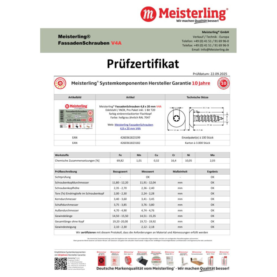 - 100 x MEISTERLING® FASSADENSCHRAUBEN INOX V4A 4,8 x 20 MM FLACHKOPF TORX T20 HELLGRAU + 1 BIT