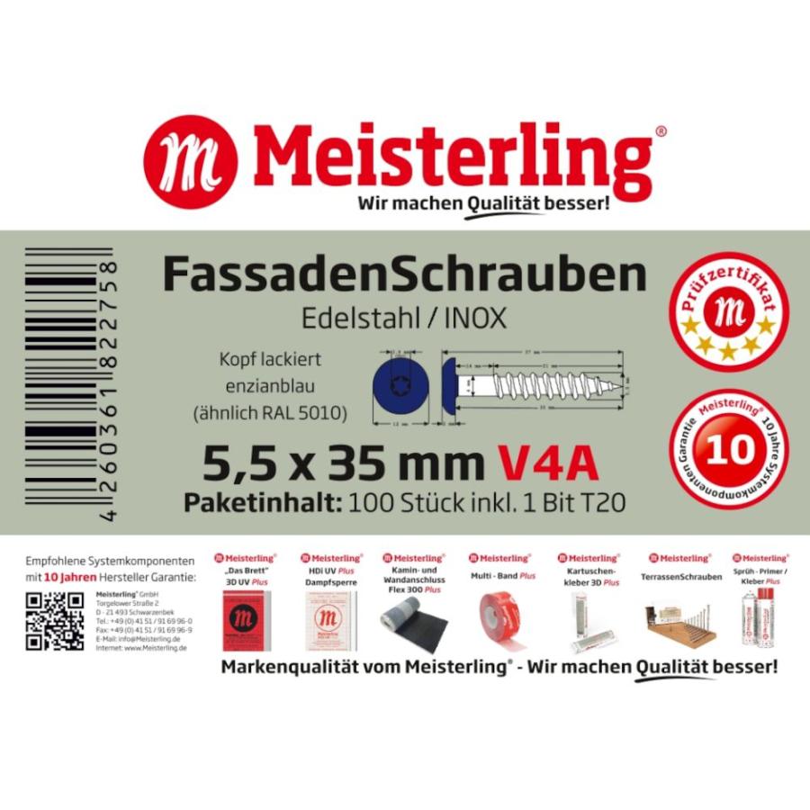 100 x MEISTERLING® FASSADENSCHRAUBEN INOX V4A 5,5 x 35 MM FLACHKOPF TORX T20 ENZIANBLAU + 1 BIT
