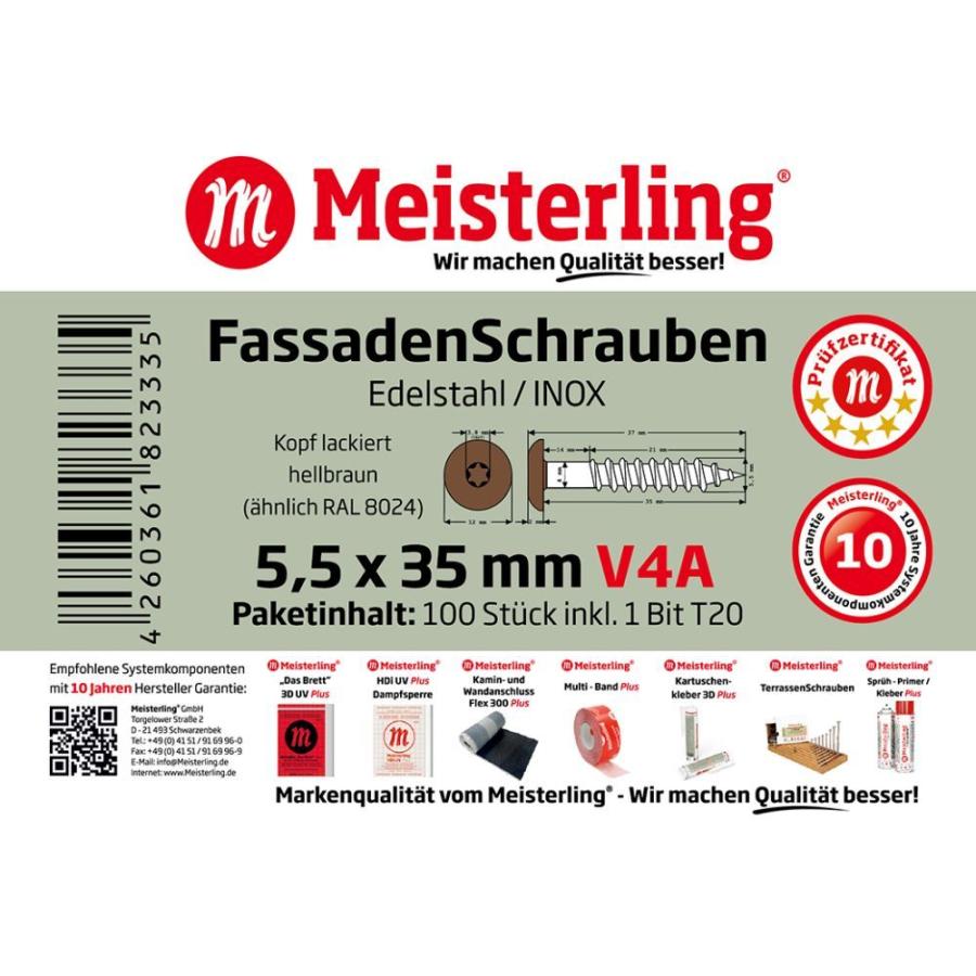 100 x MEISTERLING® FASSADENSCHRAUBEN INOX V4A 5,5 x 35 MM FLACHKOPF TORX T20 HELLBRAUN + 1 BIT