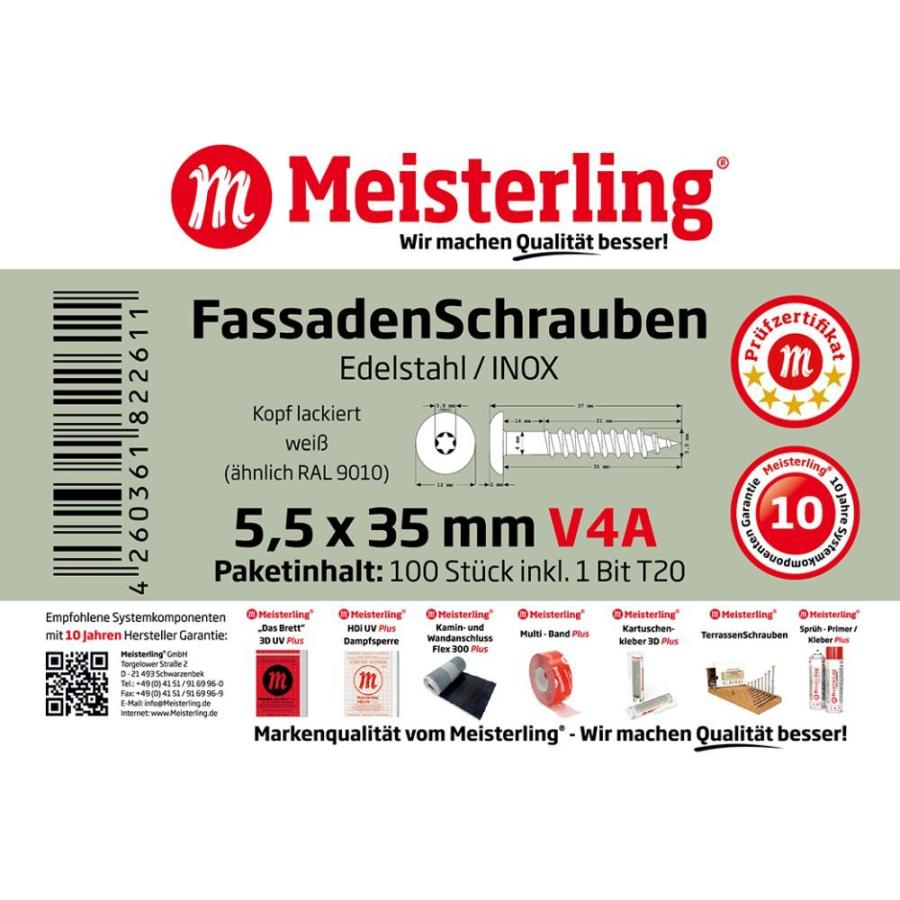 100 x MEISTERLING® FASSADENSCHRAUBEN INOX V4A 5,5 x 35 MM FLACHKOPF TORX T20 WEISS + 1 BIT