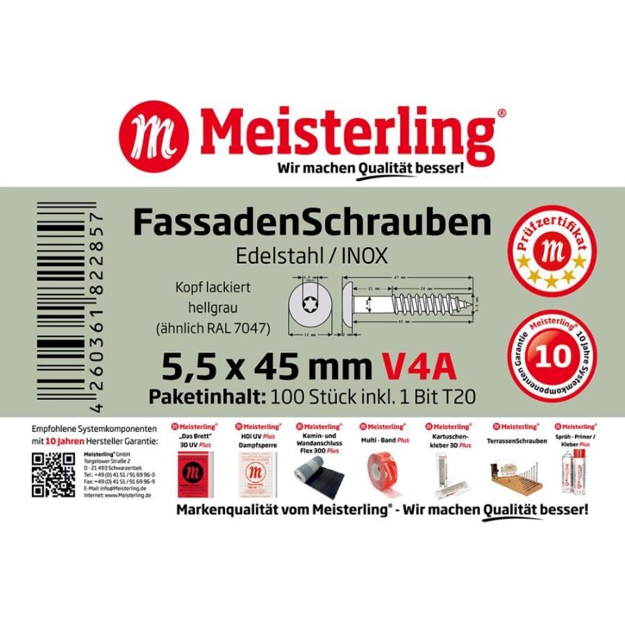 100 x MEISTERLING® FASSADENSCHRAUBEN INOX V4A 5,5 x 45 MM FLACHKOPF TORX T20 HELLGRAU ÄHNLICH RAL 7047 + 1 BIT