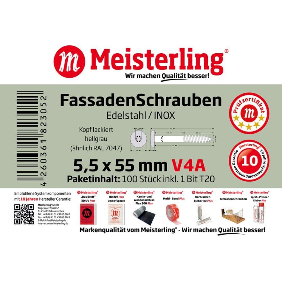 100 x MEISTERLING® FASSADENSCHRAUBEN INOX V4A 5,5 x 55 MM FLACHKOPF TORX T20 HELLGRAU ÄHNLICH RAL 7047 + 1 BIT