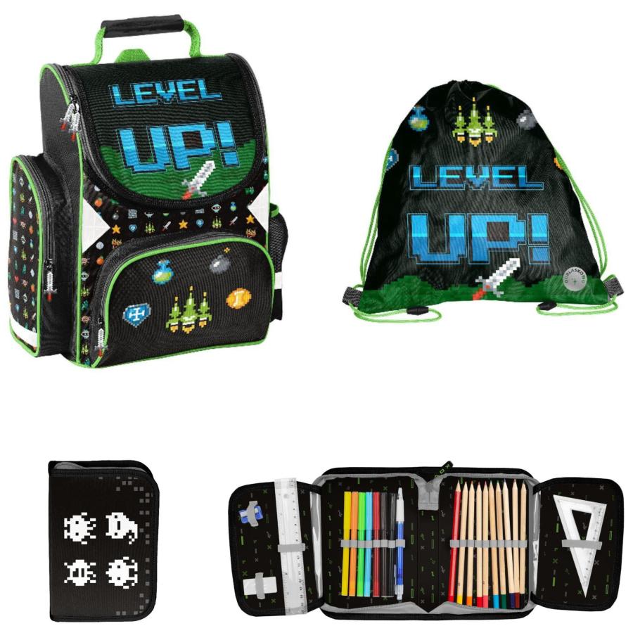 3-TEIILIGES SCHULSET: SCHULRANZEN + TURNBEUTEL + FEDERMAPPE 22-TEILIG - LEVEL UP! - SCHWARZ