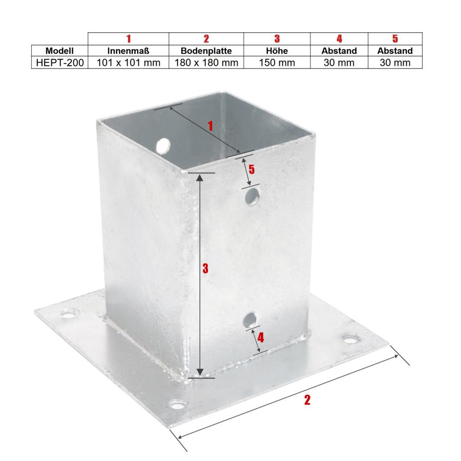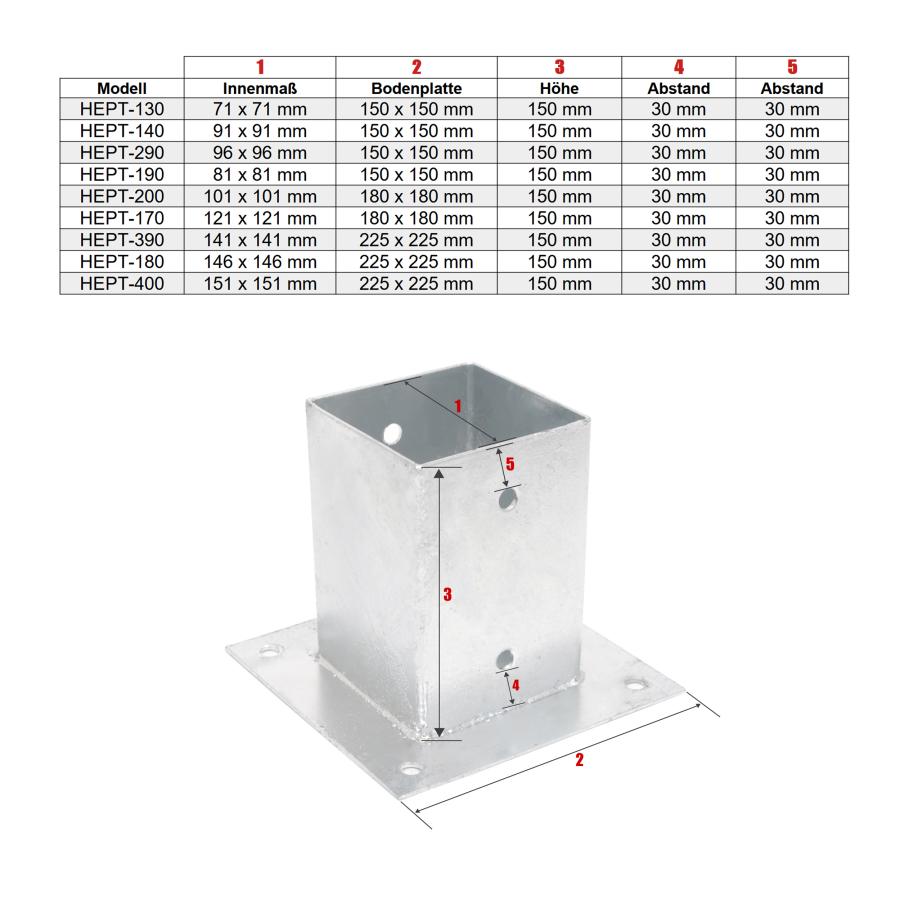 - PFOSTENTRÄGER HEPT-200 AUFSCHRAUBHÜLSE ECKIG AUF PLATTE - FÜR 10 x 10 CM PFOSTEN - STAHL FEUERVERZINKT